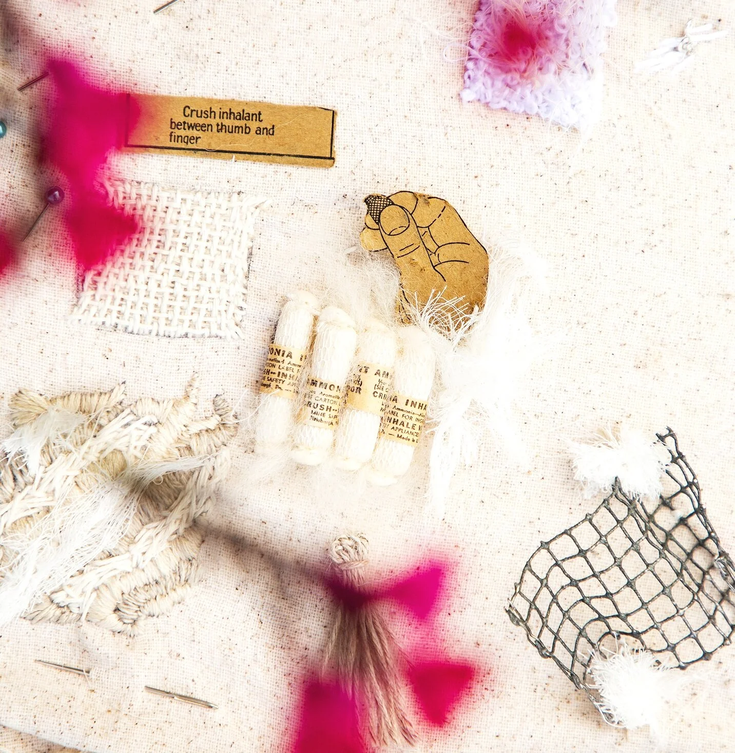 Discarded items from military first aid kit. Smelling Salts, Vintage Packaging, Gauze, Pearl Cotton